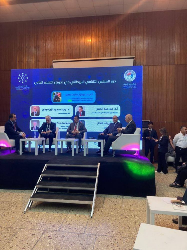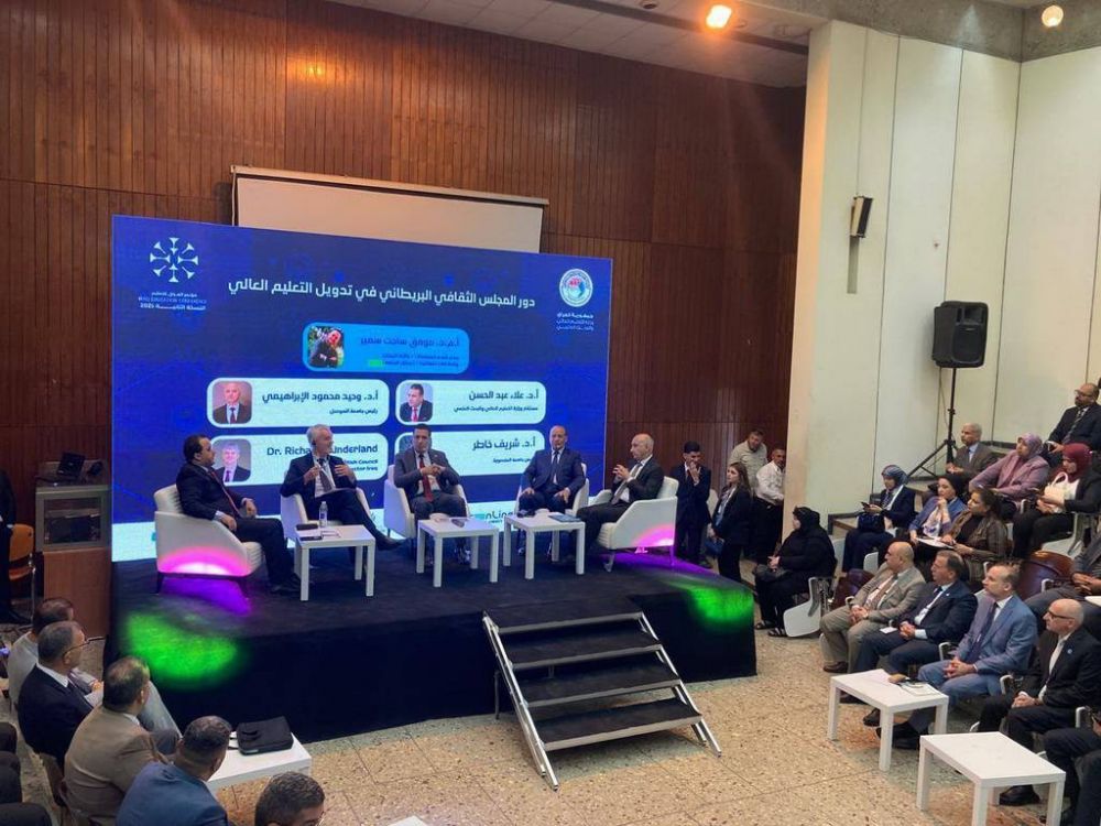 The President of Mansoura University participated in a dialogue session titled "The Role of the British Council in Internationalizing Higher Education," which reviewed university internationalization experiences. The session featured Prof. Alaa Abdul Hassan, Advisor to the Iraqi Ministry of Higher Education and Scientific Research; Prof. Wahid Al-Ibrahimi, President of the University of Mosul; and Prof. Richard Sunderland, Director of the British Council in Iraq, along with a number of academic leaders and international experts. The dialogue was moderated by Prof. Muwaffaq Sajit Samir, Director of the Organizations Department at the Department of Scholarships and Cultural Relations.