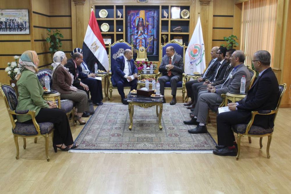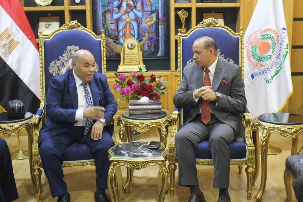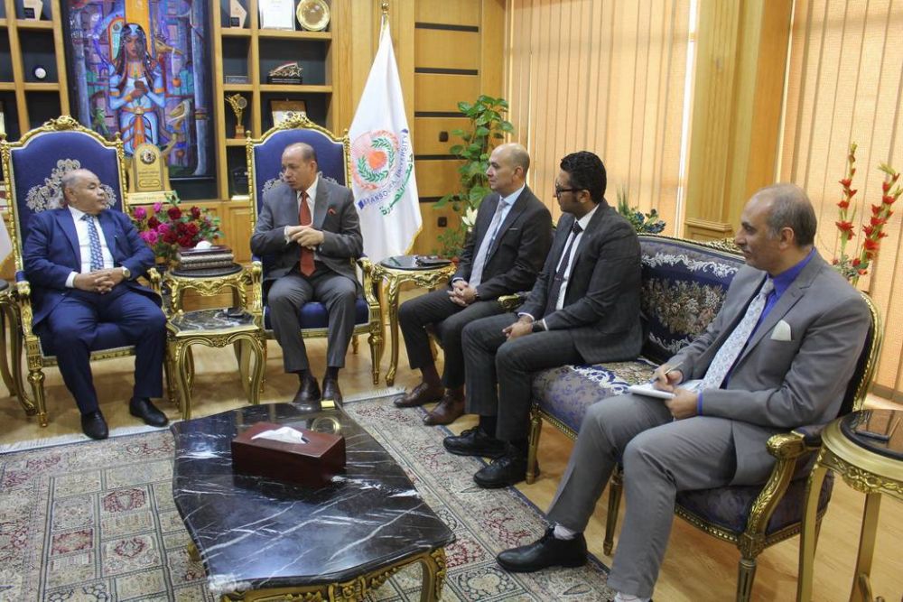 Prof. Cherif Khater, President of Mansoura University, received Mr. Ismail Al-Hadi Abid, the Cultural and Academic Attaché at the Libyan Embassy in Cairo, to discuss ways to enhance bilateral cooperation and follow up on the affairs of Libyan students studying at the university.