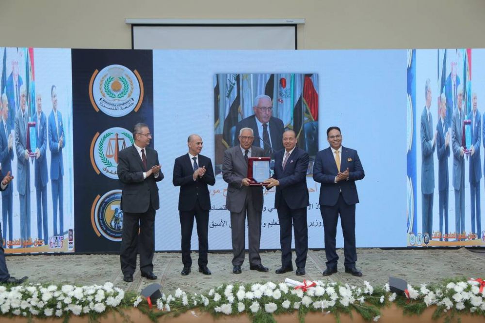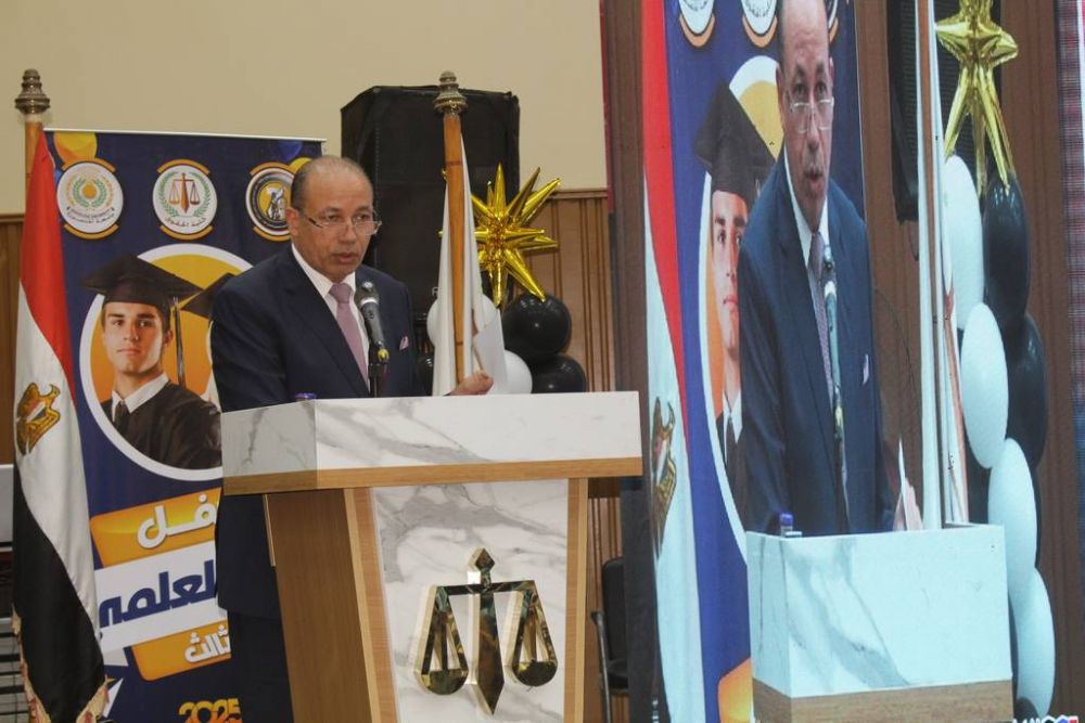 The ceremony honored Prof. Cherif Khater, the university president, and Prof. Tarek Ghalwash, the vice president. It also included honoring Prof. Ahmed Gamal El-Din Moussa, former Minister of Education and Higher Education, and Prof. El-Sayed Abdel-Khaleq, former Minister of Higher Education. In addition, distinguished academic departments were recognized, along with the best research published in the college journal according to citation rates, faculty members who earned their doctorates during the 2024/2025 academic year, teaching assistants who earned their master's degrees during the same year, outstanding researchers who won research project funding from the Scientific Research and Missions Fund, and those who received awards at the university and international levels. Distinguished visiting researchers from Arab countries and those who earned their law diplomas in 2024/2025 were also honored.