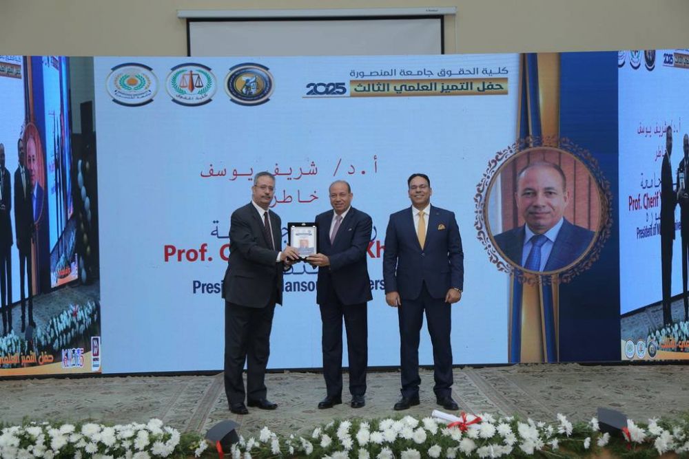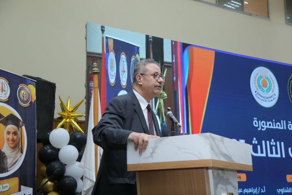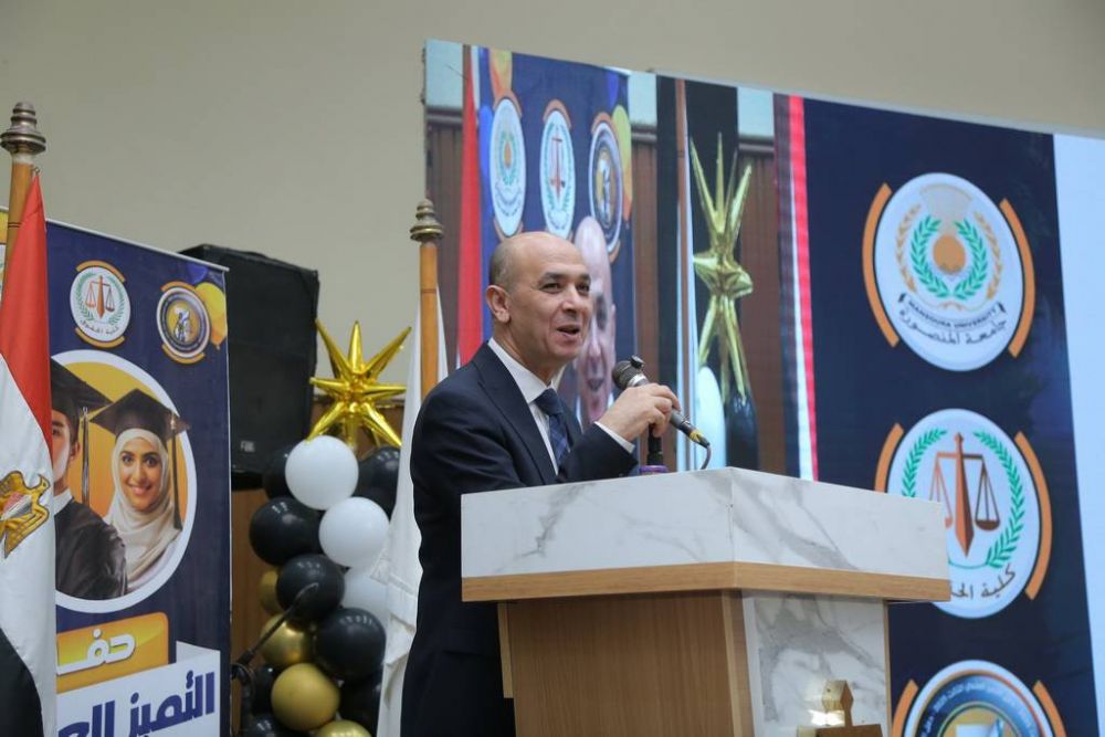 During his address at the ceremony, Prof. Cherif Khater said that the Faculty of Law at Mansoura University "is not merely an educational institution, but a source of value and meaning, a firmly established school in shaping responsible legal thought that connects knowledge with purpose, and the text with justice. He noted that the Scientific Excellence Day is "an occasion to celebrate knowledge and its practitioners, and to reflect upon a full year of work, research, and achievement." He added that academic excellence "is not achieved by chance, but is the fruit of patience, diligence, and unwavering determination," noting that the university is working to provide an educational environment and research climate that aligns with the Egyptian state's vision of human development, empowering individuals with modern knowledge tools, and enhancing their role in serving society. He affirmed that the Faculty of Law "has produced and continues to produce prominent legal and judicial leaders, thanks to the commitment of its professors and its firmly established academic values." He expressed his gratitude to the dean and faculty leaders for their efforts in organizing the celebration and for the faculty's distinguished contributions to supporting scientific research.