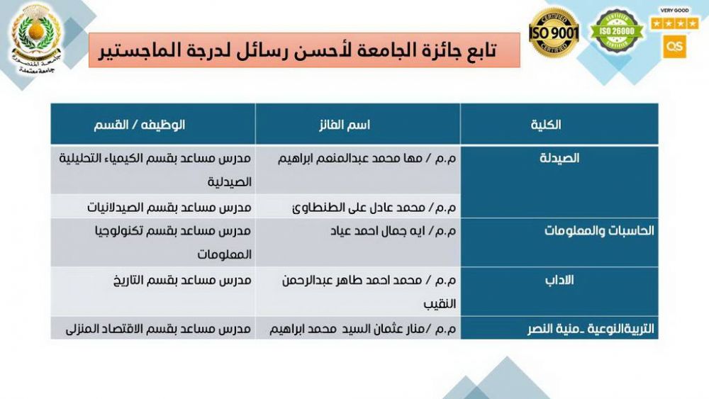 أما جوائز الجامعة لأفضل الرسائل العلمية (الماجستير)، فقد ذهبت إلى كل من: المدرس المساعد محمد حسيني عبدالعظيم محمد – بقسم جراحة المسالك البولية بكلية الطب، والمدرس المساعد سلمى محمد الششتاوي محمد أبوقمر – بقسم الكيمياء (كيمياء فيزيائية) بكلية العلوم، والمدرس المساعد روان أيمن عوض الله أحمد – بقسم النبات بكلية العلوم (مناصفة) مع المدرس المساعد هاجر جمعة القصبي محمود – بقسم الكيمياء بكلية العلوم، والمدرس المساعد أحمد سمير محمد أحمد عبدالعظيم جردوح – بقسم الهندسة الكهربية بكلية الهندسة، والمدرس المساعد مها محمد عبدالمنعم إبراهيم – بقسم الكيمياء التحليلية الصيدلية بكلية الصيدلة، والمدرس المساعد محمد عادل علي الطنطاوي – بقسم الصيدلانيات بكلية الصيدلة، والمدرس المساعد آية جمال أحمد عياد – بقسم تكنولوجيا المعلومات بكلية الحاسبات والمعلومات، والمدرس المساعد محمد أحمد طاهر عبدالرحمن النقيب – بقسم التاريخ بكلية الآداب، والمدرس المساعد منار عثمان السيد محمد إبراهيم – بقسم الاقتصاد المنزلي بكلية التربية النوعية (منية النصر).
