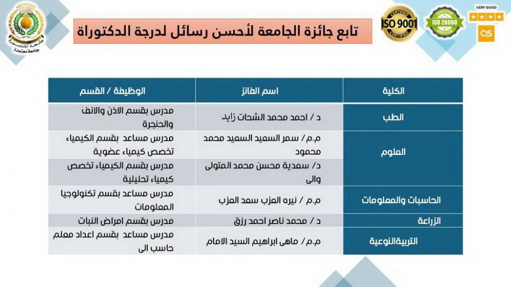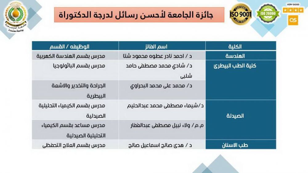 وفي جوائز الجامعة لأفضل الرسائل العلمية (الدكتوراه)، فاز بها كل من: الدكتور أحمد نادر عطوة محمود شتا – مدرس بقسم الهندسة الكهربية بكلية الهندسة، والدكتور شادي محمد مصطفى حامد شلبي – مدرس بقسم الباثولوجيا بكلية الطب البيطري، والدكتور محمد علي محمد البحراوي – مدرس بقسم الجراحة والتخدير والأشعة البيطرية بكلية الطب البيطري، والدكتورة شيماء مصطفى محمد عبدالحليم – مدرس بقسم الكيمياء التحليلية الصيدلية بكلية الصيدلة، والمدرس المساعد ولاء نبيل مصطفى عبدالغفار – بقسم الكيمياء التحليلية الصيدلية بكلية الصيدلة، والدكتورة هدى صالح إسماعيل صالح – مدرس بقسم العلاج التحفظي بكلية طب الأسنان، والدكتور أحمد محمد الشحات زايد – مدرس بقسم الأنف والأذن والحنجرة بكلية الطب، والمدرس المساعد سمر السعيد السعيد محمد محمود – بقسم الكيمياء (كيمياء عضوية) بكلية العلوم، والدكتورة سعدية محسن محمد المتولي والي – مدرس بقسم الكيمياء (كيمياء تحليلية) بكلية العلوم، والمدرس المساعد نيرة العزب سعد العزب – بقسم تكنولوجيا المعلومات بكلية الحاسبات والمعلومات، والدكتور محمد ناصر أحمد رزق – مدرس بقسم أمراض النبات بكلية الزراعة، والمدرس المساعد ماهي إبراهيم السيد الإمام – بقسم إعداد معلم حاسب آلي بكلية التربية النوعية.