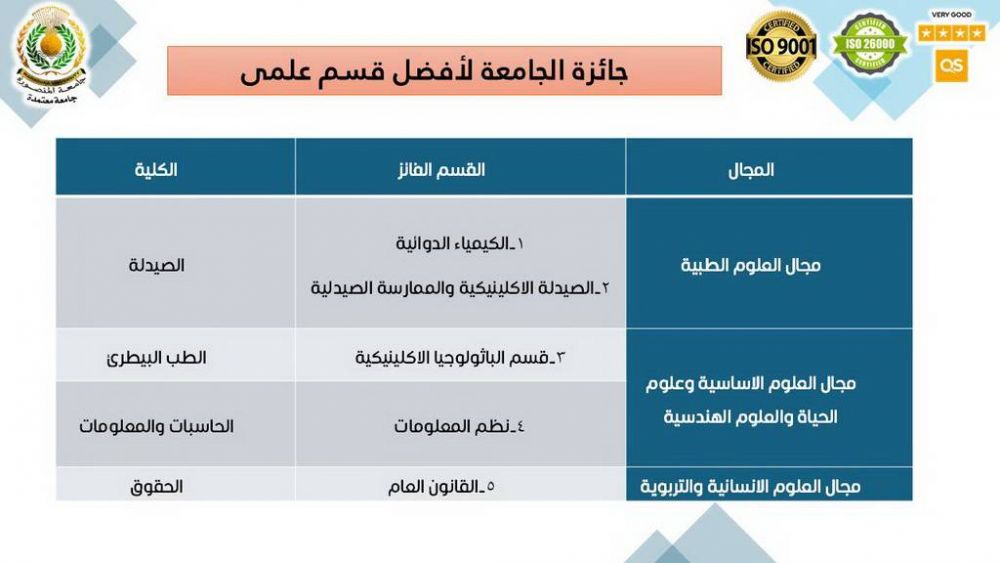 وفيما يخص جائزة الجامعة لأفضل قسم علمي، فقد فاز بها قسم الكيمياء الدوائية بكلية الصيدلة، وقسم الصيدلة الإكلينيكية والممارسة الصيدلية بكلية الصيدلة في مجال العلوم الطبية، وقسم الباثولوجيا الإكلينيكية بكلية الطب البيطري، وقسم نظم المعلومات بكلية الحاسبات والمعلومات في مجال العلوم الأساسية وعلوم الحياة والعلوم الهندسية، وقسم القانون العام بكلية الحقوق في مجال العلوم الإنسانية والتربوية.
