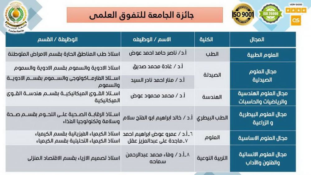 أما جوائز الجامعة للتفوق العلمي، فقد حصل عليها كل من: الأستاذ الدكتور ناصر حامد أحمد عوض – أستاذ طب المناطق الحارة بكلية الطب في مجال العلوم الطبية، والأستاذة الدكتورة غادة محمد صديق – أستاذ الأدوية والسموم بكلية الصيدلة، والأستاذة الدكتورة منار أحمد نادر السيد – أستاذ الفارماكولوجي والسموم بكلية الصيدلة في مجال العلوم الصيدلية. وفي مجال العلوم الهندسية والرياضيات والحاسبات الأستاذ الدكتور محمد محمود مصطفى عوض – أستاذ القوى الميكانيكية بكلية الهندسة. والأستاذ الدكتور خالد إبراهيم أبو الفتح سلام – أستاذ الرقابة الصحية على اللحوم بكلية الطب البيطري في مجال العلوم الزراعية والبيطرية. والأستاذ الدكتور عمرو عوض إبراهيم أحمد – أستاذ الكيمياء الفيزيائية بكلية العلوم، والأستاذة الدكتورة ماجدة علي عبدالعزيز عقل – أستاذ الكيمياء التحليلية بكلية العلوم في مجال العلوم الأساسية. وفي مجال العلوم الإنسانية والفنون والآداب الأستاذة الدكتورة وفاء محمد محمد عبدالرحمن سماحة – أستاذ تصميم الأزياء بكلية التربية النوعية.