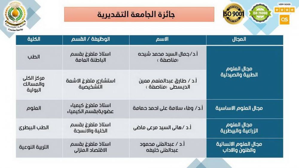 جامعة المنصورة تعلن أسماء الفائزين بجوائزها لعام 2025