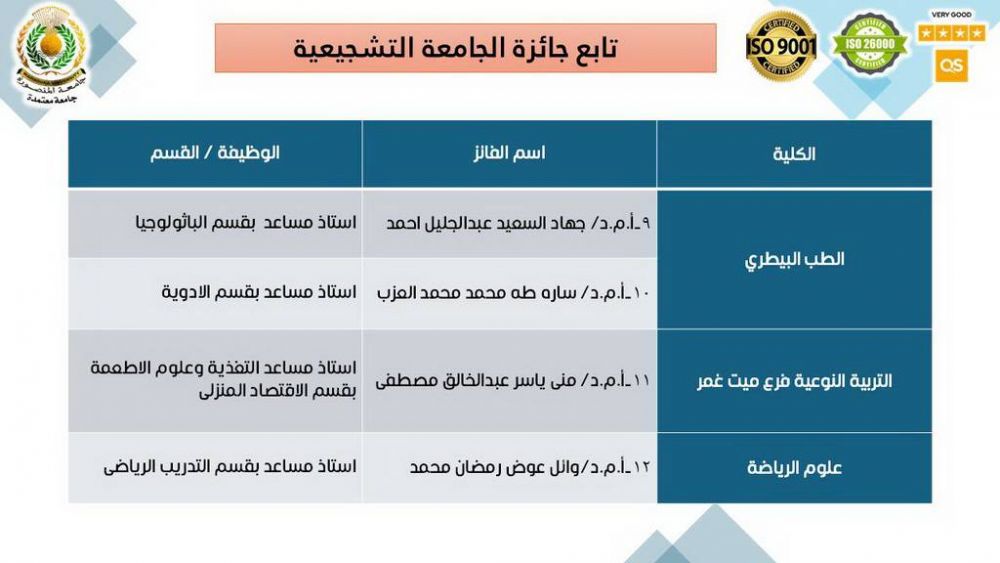 وفي جوائز الجامعة التشجيعية، جاءت الأسماء الفائزة على النحو التالي: من كلية الطب الدكتورة راندا إبراهيم السعيد الجمل – أستاذ مساعد بقسم الكيمياء الحيوية، والدكتورة نسرين السيد مرسي علي – أستاذ مساعد بقسم الأمراض الصدرية. ومن كلية الصيدلة الدكتورة مها هشام عبدالقادر إبراهيم – أستاذ مساعد بقسم الأدوية والسموم، والدكتورة أسماء كمال الدين أحمد محمد – مدرس بقسم الكيمياء التحليلية الصيدلية. ومن كلية الهندسة الدكتور أسامة محمد حامد علي – أستاذ مساعد بقسم هندسة القوى الميكانيكية، والدكتور تامر فوزي مجاهد عبدالدايم – أستاذ مساعد بقسم الهندسة الكهربية. ومن كلية العلوم الدكتورة دعاء أحمد محمد علي كسبة – مدرس بقسم الكيمياء (كيمياء فيزيائية)، والدكتور فتحي سامي محمد عوض – أستاذ مساعد بقسم الكيمياء (كيمياء تحليلية). ومن كلية الطب البيطري الدكتورة جهاد السعيد عبدالجليل أحمد – أستاذ مساعد بقسم الباثولوجيا، والدكتورة سارة طه محمد محمد العزب – أستاذ مساعد بقسم الأدوية. ومن كلية التربية النوعية – فرع ميت غمر، الدكتورة منى ياسر عبدالخالق مصطفى – أستاذ مساعد بقسم التغذية وعلوم الأطعمة. ومن كلية علوم الرياضة الدكتور وائل عوض رمضان محمد – أستاذ مساعد بقسم التدريب الرياضي.
