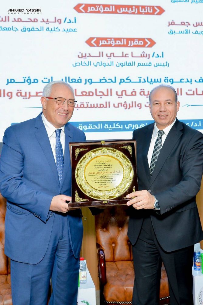 وشهد ختام الجلسة الافتتاحية تكريم محافظ الدقهلية ورئيس جامعة المنصورة وأمين المجلس الأعلى للجامعات، إلى جانب عدد من الشخصيات القانونية والأكاديمية البارزة، تقديرًا لإسهاماتهم العلمية والمجتمعية، وذلك قبل إعلان بدء فعاليات الجلسات العلمية المتخصصة للمؤتمر.