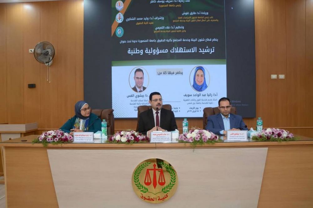 في إطار توجهات الدولة المصرية نحو تحقيق الاستدامة، وانطلاقًا من رؤية مصر 2030، نظّمت كلية الحقوق بجامعة المنصورة ندوة بعنوان «ترشيد الاستهلاك مسؤولية وطنية»، وذلك تحت رعاية الدكتور شريف خاطر، رئيس الجامعة، وريادة الدكتور طارق غلوش، نائب رئيس الجامعة لشئون الدراسات العليا والبحوث والمشرف على قطاع خدمة المجتمع وتنمية البيئة، وإشراف الدكتور وليد الشناوي، عميد الكلية، وتنظيم الدكتور علاء التميمي، وكيل الكلية لشئون خدمة المجتمع وتنمية البيئة.