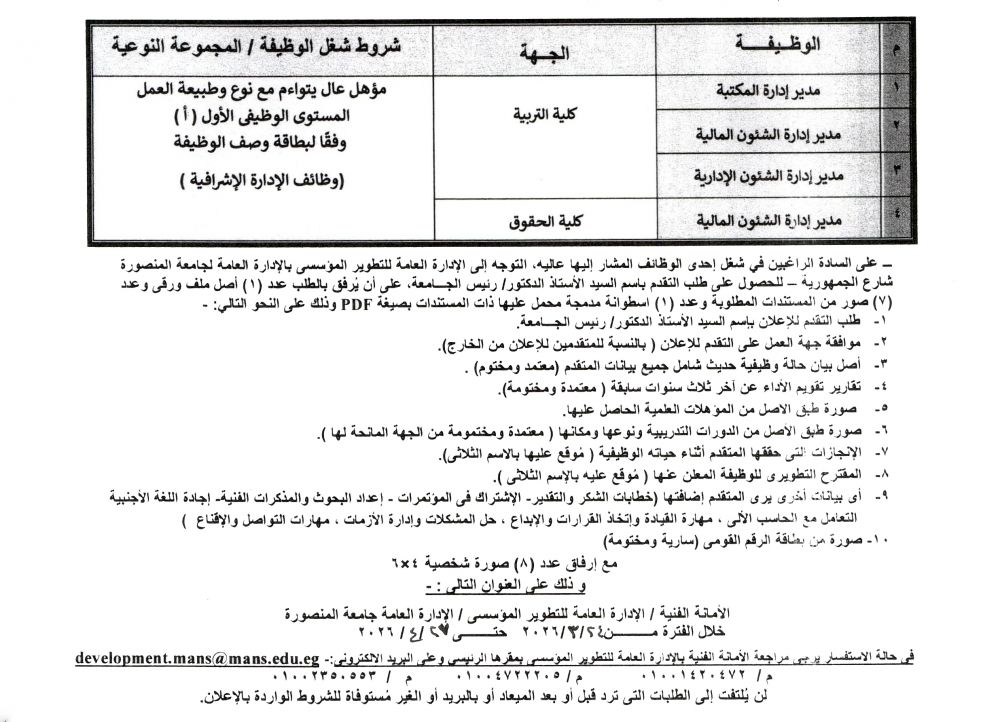 اعلان جامعة المنصورة عن حاجتها لشغل الوظائف الاشرافية التاليه